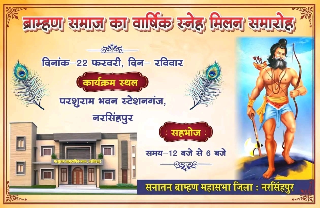 नरसिंहपुर :- सनातन ब्राह्मण महासभा जिला नरसिंहपुर के तत्वावधान में आज, 22 फरवरी रविवार को वार्षिक ब्राह्मण स्नेह मिलन समारोह…