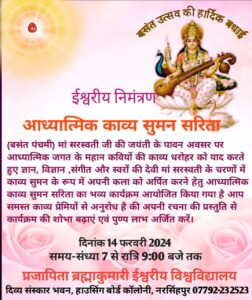 अन्तर्राष्ट्रीय संस्थान प्रजापिता ब्रह्माकुमारी ईश्वरीय विश्वविद्यालय नरसिंहपुर के तत्वावधान में बसंत पंचमी के पावन अवसर पर स्वर एवम् कला की देवी मां सरस्वती जी की जयंति के उपलक्ष्य में जिला संचालिका ब्रह्माकुमारी कुसुम बहिन जी के पावन सानिध्य में गणमान्य नागरिक बन्धुओं की उपस्थिति में हमारे जिला के प्रसिद्ध वरिष्ठ कवि गणों के द्वारा मां की महिमा पर आधारित आध्यात्मिक काव्य सरिता का भव्य कार्यक्रम बसन्त पंचमी 14 फरवरी 2024,बुधवार रात्रि 7 से 9 बजे तक आयोजित किया जा रहा है । अतः आप सभी से अनुरोध है कि इस अलौकिक कार्यक्रम में इष्ट मित्रों सहित सपरिवार पधार कर पुण्य लाभ अर्जितकरें।