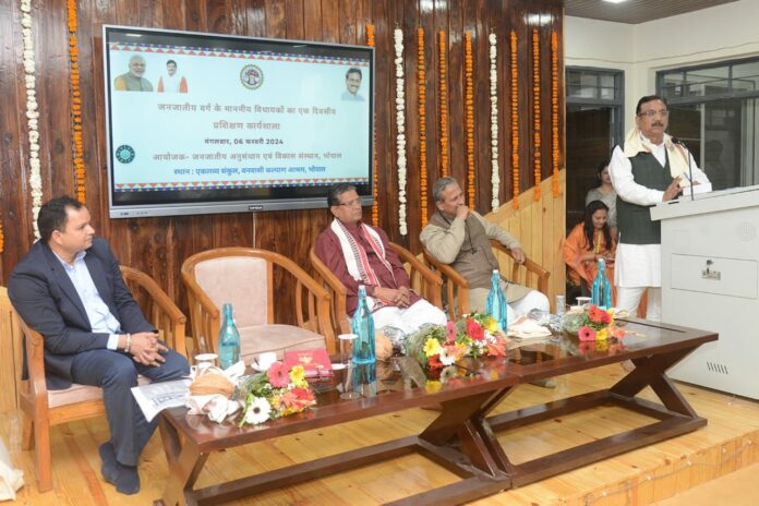 कार्यशाला कार्य को संबोधित करते हुये जनजातीय कार्य मंत्री डा. शाह ने भारत की आजादी के लिए अपने प्राणों की आहुति देने वाले जनजातीय वीरनायकों के योगदान को याद किया और जनजातीय क्षेत्रों में अंग्रेजी के साथ-साथ अपनी भाषा में पढ़ाई पर भी विशेष ध्यान दिये जाने पर बल दिया। उन्होंने अपने खुद के अनुभवों और उनसे प्रेरणा लेकर जनजातीय वर्ग के कल्याण के लिए शासन द्रारा बनाई जा रही कल्याणकारी योजनाओं का भी उल्लेख किया। टीआरआई के अपर आयुक्त श्री लक्ष्मण सिंह मरकाम ने विधायकों को जनजातियों के विशेष प्रावधान पांचवी अनुसूची एवं पेसा एक्ट पर विस्तृत प्रशिक्षण दिया। अखिल भारतीय वनवासी कल्याण आश्रम के राष्ट्रीय संगठन मंत्री श्री जोग ने भारत की जनजातियों हेतु एक नीति दृष्टिपत्र और उसमें सम्मिलित जनजातियों के कल्याण एवं हितरक्षा विषय पर विस्तार से अपने विचार रखे। अखिल भारतीय वनवासी कल्याण आश्रम के राष्ट्रीय अध्यक्ष खराडी ने बताया कि यदि हमें अपने देश को विकसित बनाना है, तो जनजातीय वर्ग को विकसित करना आवश्यक है। हम सबको मिलकर आदिवासीजन और इनकी संस्कृति को सुरक्षित रखना होगा। कार्यशाला की प्रस्तावना पेसा सेल प्रमुख श्री लवकुश मेहरा ने प्रस्तुत की। संचालन जनजातीय प्रकोष्ठ, राजभवन की विषय विशेषज्ञ डा. दीपमाला रावत ने किया। कार्यशाला में जनजातीय प्रकोष्ठ राजभवन के सचिव, जनजातीय कार्य विभाग के संयुक्त संचालक, जनजातीय वर्ग के लिये अनुसंधान से जुड़े अधिकारीगण, सहायक आयुक्त वीरेन्द्र सिंह एवं अन्य प्रशासनिक अधिकारीगण उपस्थित थे।