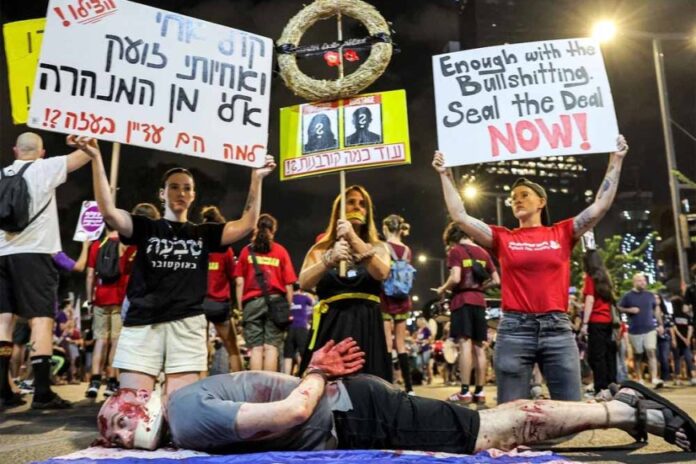 हजारों इजरायली एक बार फिर देशभर में सड़कों पर उतर आए और नए चुनावों की मांग की। बंधकों के परिवारों ने तेल अवीव के बंधक चौक पर साप्ताहिक रैली निकाली। रैली में उन्होंने छह बंधकों को बचाने में विफल रहने के लिए सरकार की आलोचना की। उनके शव कुछ दिन पहले गाजा से बरामद किए गए थे। सरकार विरोधी प्रदर्शनों में हिरासत में लिए गए लोगों का प्रतिनिधित्व करने वाले एक समूह ने कहा कि यरुशलम में तीन प्रदर्शनकारियों को गिरफ्तार किया गया।