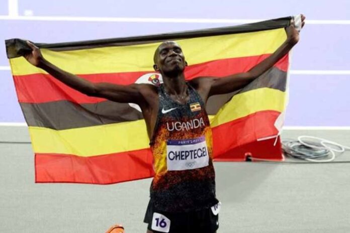 युगांडा के जोशुआ चेप्टेगी, जो तीन बार विश्व 10,000 मीटर चैंपियन हैं, स्टेड डी फ्रांस में चल रहे पेरिस 2024 खेलों के पहले ट्रैक और फील्ड फाइनल में ओलंपिक 10,000 मीटर चैंपियन बने।