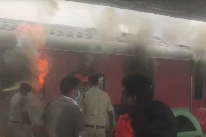 छत्तीसगढ़ के कोरबा से विशाखापट्टनम पहुंची कोरबा एक्सप्रेस (18517) ट्रेन की बोगियों में रविवार को अचानक से भीषण आग लग गई. यह ट्रेन कोरबा से तिरुमाला जा रही थी. जब ट्रेन स्टेशन पर रूकी तो इसी दौरान इसमें अचानक से आग लग गई. आग लगने की यह घटना स्टेशन के चौथे नंबर के प्लेटफॉर्म पर हुई.