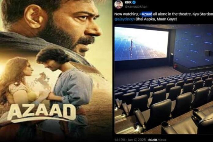 Azaad: बॉलीवुड एक्टर अजय देवगन के भांजे अमान देवगन और रवीना टंडन की डेब्यू फिल्म ‘Azaad’ 17 जनवरी 2025 को बड़े पर्दे पर रिलीज हो गई है. फिल्म का ट्रेलर जहां चर्चा में रहा तो वहीं लोगों ने फिल्म को मिक्स रिव्यू दिया. इसी बीच बॉलीवुड एक्टर केआरके यानी कमाल आर खान ने सोशल मीडिया पर एक फोटो शेयर की है, जो कि खाली थियेटर की है. फोटो के साथ उन्होंने कैप्शन दिया, अब थियेटर में अकेले ‘Azaad’ देख रहा हूं. क्या स्टारडम है अजय देवगन भाई आपका, मान गए. इस फोटो पर लोग रिएक्शन देते हुए नजर आ रहे हैं.
