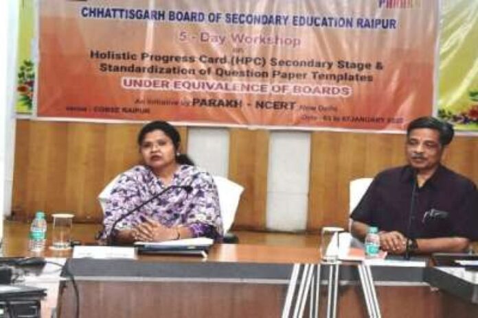 रायपुर : छत्तीसगढ़ माध्यमिक शिक्षा मंडल, रायपुर में राष्ट्रीय शिक्षा नीति 2020 के अंतर्गत एनसीईआरटी परख नई दिल्ली के निर्देशानुसार पाँच दिवसीय कार्यशाला सह प्रशिक्षण का शुभारंभ किया गया। इस कार्यक्रम का उद्देश्य होलिस्टिक प्रोग्रेस कार्ड और प्रश्न पत्र टेम्पलेट के मानकीकरण पर शिक्षकों को प्रशिक्षण प्रदान करना है। यह प्रशिक्षण आगामी शिक्षा सत्र में राज्य के सभी हाई एवं हायर सेकंडरी स्कूलों के प्राचार्यों व शिक्षकों को प्रशिक्षित करने के लिए मास्टर ट्रेनर्स तैयार करेगा।