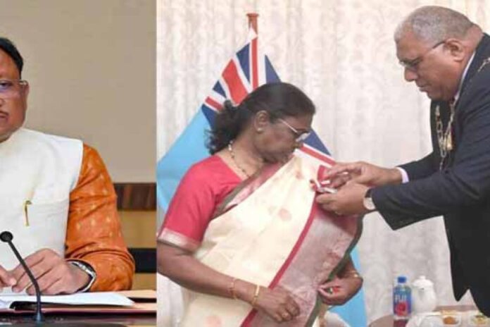 राष्ट्रपति द्रौपदी मुर्मु को फिजी के सर्वोच्च नागरिक सम्मान दिए जाने पर सीएम विष्णु देव साय ने बधाई और शुभकामनाएं दी है। उन्होंने अपने सोशल मीडिया साइट एक्स पर लिखा है कि राष्ट्रपति द्रौपदी मुर्मु को फिजी के सर्वोच्च नागरिक सम्मान ‘Companion of the Order of Fiji’ से विभूषित होने पर हार्दिक बधाई एवं शुभकामनाएं। यह हम सभी भारतवासियों के लिए गौरवशाली क्षण है।