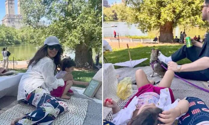 एक और फोटो में मालती जमीन पर लेटी हुई हैं और उनके बगल में पापा निक बैठे हैं। पास में ही पालतू डॉग भी है। सभी ने पार्क में पिकनिक मनाई।