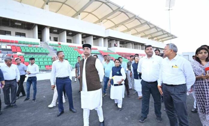 निरीक्षण के दौरान मंत्री श्री सारंग ने एथलेटिक्स स्टेडियम, लाइटिंग सिस्टम, प्रैक्टिस हॉकी फील्ड, वार्म-अप ट्रैक, मल्टीलेवल पार्किंग, फुटबॉल फील्ड, वॉटर एवं सीवेज ट्रीटमेंट प्लांट और अन्य निर्माण कार्यों का जायज़ा लिया। उन्होंने प्रोजेक्ट की कंस्ट्रक्शन डिटेल्स का प्रस्तुतीकरण भी देखा और तकनीकी पहलुओं पर अधिकारियों से चर्चा की।