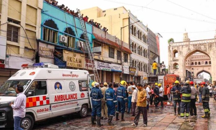 तेलंगाना में ऐतिहासिक चारमीनार के पास गुलजार हाउस की एक इमारत में रविवार को भीषण आग लग गई। हादसे में आठ लोगों की मौत हो गई। यहां एक निजी अस्पताल के वरिष्ठ अधिकारी ने बताया कि आठ लोगों को मृत अवस्था में लाया गया था। मुख्यमंत्री ए. रेवंत रेड्डी ने घटना पर दुख व्यक्त किया। उन्होंने वरिष्ठ अधिकारियों को इमारत में फंसे लोगों को बचाने के लिए सभी आवश्यक उपाय करने का निर्देश दिया।