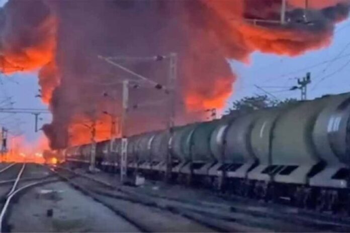 तमिलनाडु में तिरुवल्लूर के निकट डीजल ले जा रही मालगाड़ी में रविवार सुबह भीषण आग लग गई। रेलवे के एक अधिकारी ने यह जानकारी दी। उन्होंने बताया कि आग पहले मालगाड़ी के एक डिब्बे में लगी और फिर तेजी से दूसरे डिब्बों में फैल गई। आग की तेज लपटें काफी ऊपर तक उठती नजर आईं, जिसका वीडियो क्लिप सोशल मीडिया पर वायरल हो रहा है। गनीमत रही कि इस हादसे में किसी के हताहत होने की सूचना नहीं है।