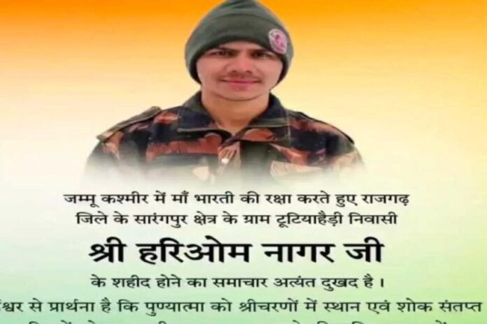 मुख्यमंत्री डॉ. मोहन यादव ने जम्मू-कश्मीर में अपना कर्तव्य पालन करते हुए सर्वोच्च बलिदान देने वाले सैनिक श्री हरिओम नागर को विनम्र श्रद्धांजलि अर्पित की है। मुख्यमंत्री डॉ. यादव ने कहा कि उनकी संवेदनाएं शोकाकुल परिजन के साथ हैं। मध्यप्रदेश की माटी के वीर सपूत का सर्वोच्च बलिदान मां भारती की सेवा और रक्षा के लिए सदैव देशवासियों को प्रेरित करता रहेगा। मुख्यमंत्री डॉ. यादव ने बाबा महाकाल से दिवंगत आत्मा को अपने श्रीचरणों में स्थान देने के लिए भी प्रार्थना की है।