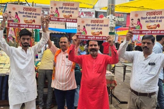 राजधानी भोपाल में संस्कृति बचाओ मंच रक्षाबंधन से पहले शुक्रवार को अभियान चलाकर राखी की दुकानों पर पहुंचने वाली महिलाओं और युवतियों से अपील की है कि राखी केवल सनातन धर्म के अनुयायी भाइयों को ही बांधें, ताकि किसी प्रकार की आपराधिक या जिहादी घटना की आशंका से बचा जा सके। मंच के पदाधिकारियों ने इस दौरान सनातनी संस्कृति के प्रति जागरूक किया। इस दौरान महिलाओं को कहा गया कि सनातनी भाइयों की कलाई पर ही राखी बांधने से पवित्रता भी बनी रहेगी और सुरक्षा भी सुनिश्चित होगी।