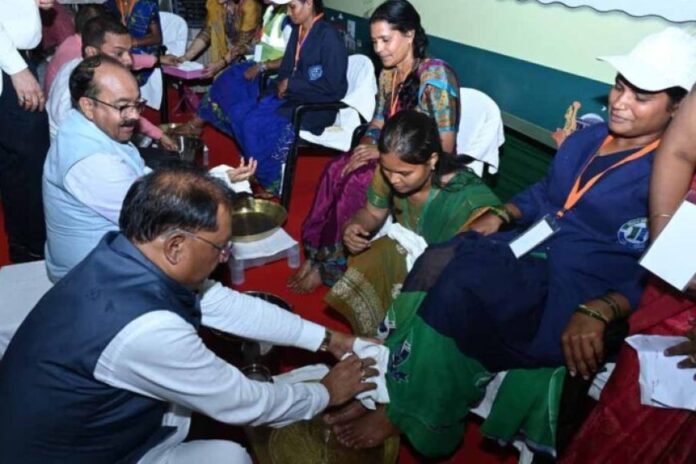मुख्यमंत्री एवं उप मुख्यमंत्री ने पैर पखारकर स्वच्छता दीदियों का किया सम्मान