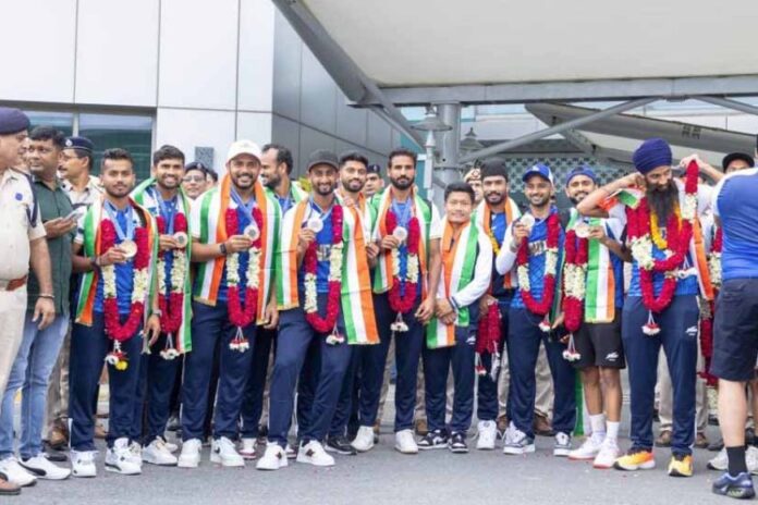 ओलंपिक कांस्य पदक विजेता भारतीय पुरूष हॉकी टीम के सदस्यों का शनिवार की सुबह पेरिस से यहां पहुंचने पर सैकड़ों की संख्या में हवाई अड्डे पर मौजूद खेलप्रेमियों ने गर्मजोशी से स्वागत किया। भारतीय टीम बृहस्पतिवार को स्पेन को कांस्य पदक के मुकाबले में 2.1 को हराकर हॉकी में 13वां ओलंपिक पदक जीतकर लौटी। भारतीय हॉकी की दीवार गोलकीपर पी आर श्रीजेश पेरिस ओलंपिक के समापन समारोह में दो पदक विजेता निशानेबाज मनु भाकर के साथ भारत के ध्वजवाहक होंगे। श्रीजेश, अमित रोहिदास, राजकुमार पाल, अभिषेक, सुखजीत सिंह और संजय समापन समारोह के बाद लौटेंगे। कप्तान हरमनप्रीत सिंह और टीम का फूलों की मालाओं और ढोल ताशे के साथ इंदिरा गांधी हवाई अड्डे पर स्वागत किया गया।