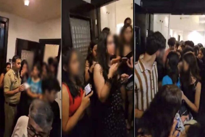 नोएडा के सेक्टर-94 स्थित एक हाउसिंग सोसाइटी के एक फ्लैट में पुलिस ने आधी रात के बाद छापेमारी कर 40 लड़के-लड़कियों को हिरासत में लिया है। पकड़े गए लड़के-लड़कियां कथित तौर पर फ्लैट के अंदर ‘रेव पार्टी’ कर रहे थे। यह सभी एक नामी यूनिवर्सिटी के स्टूडेंट हैं। पुलिस ने छापेमारी के दौरान फ्लैट के अंदर से भारी मात्रा में हरियाणा ब्रांड की शराब की बोतलें और हुक्का आदि बरामद किए हैं।