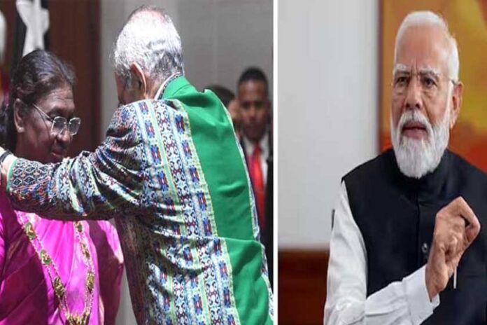 प्रधानमंत्री नरेन्द्र मोदी ने रविवार को राष्ट्रपति द्रौपदी मुर्मू को तिमोर-लेस्ते के सर्वोच्च नागरिक सम्मान ‘ग्रैंड-कॉलर ऑफ द ऑर्डर ऑफ तिमोर-लेस्ते’ से सम्मानित किए जाने को देश के लिए ‘गर्व का क्षण’ करार दिया और कहा कि यह दोनों देशों के बीच मजबूत संबंधों व आपसी सम्मान को दर्शाता है।