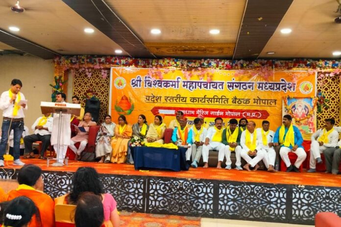 भोपाल। श्री विश्वकर्मा महापंचायत मध्य प्रदेश की प्रदेश कार्यकारिणी की बैठक राजधानी भोपाल में संपन्न हुई। बैठक का प्रारंभ भगवान विश्वकर्मा के पूजन तथा दीप प्रज्वलन से हुआ। प्रदेश कार्यकारिणी बैठक में मध्यप्रदेश के सैकड़ों पदाधिकारीयों ने सम्मिलित होकर अपने विचार रखे। प्रदेश कार्यकारिणी बैठक में संगठन विस्तार, सामाजिक जनगणना सहित केंद्र व राज्य सरकार की जनकल्याणकारी योजनाओं का लाभ अंतिम पंक्ति तक पहुंचाने पर चर्चा की गई। स्वागत भाषण और उद्बोधन के दौरान श्री विश्वकर्मा कल्याण बोर्ड के सदस्य तथा श्री विश्वकर्मा महापंचायत के प्रदेश संगठन महामंत्री परमानंद विश्वकर्मा ने संगठन की आगामी योजनाओं पर प्रकाश डाला। उन्होंने कहा कि संगठन का विस्तार तेज़ी से मंडल स्तर तक किया जाएगा, साथ ही उन्होंने सामाजिक युवाओं से संगठन से जुड़कर समाजसेवा करने की अपील की। अपने अध्यक्षीय भाषण में प्रदेश अध्यक्ष रामकिशोर विश्वकर्मा ने नवनियुक्त पदाधिकारियों का स्वागत करते हुए संगठन की कार्यप्रणाली से उन्हें अवगत कराया। उन्होंने कहा कि विश्वकर्मा समाज के सर्वांगीण विकास में अपनी सहभागिता सभी को सुनिश्चित करनी चाहिए।